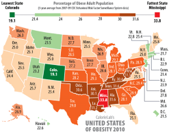 CalorieLab.com (now defunct) was a site offering health news and nutritional and fitness reference information. Each year they published a map summarising obesity levels by state in using an easy to understand safety/danger scale.