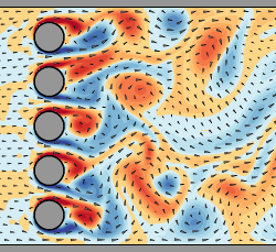 Fluid flow through a coarse grating, background vorticity painted with polarity/RdYlBu, arrows by vfplot